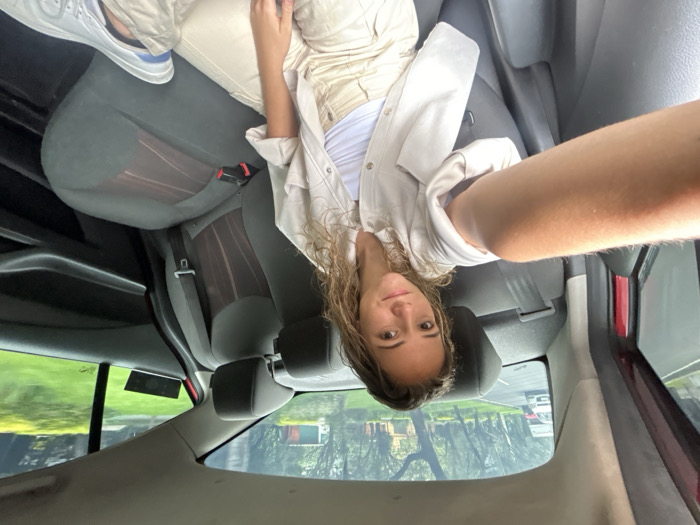 A female subject is depicted in the rear passenger compartment of a vehicle, located in Naucalpan de Juárez, Mexico. She is seated on the passenger-side rear seat, facing forward towards the front of the vehicle, and is holding a camera with her left arm extended to capture a selfie. The subject has light brown, wavy hair and is wearing a light-colored collared jacket over a white top, paired with light-colored pants. A white athletic shoe with blue accents is visible on her right foot. The vehicle's interior features grey fabric seats with a striped pattern on the backrests, grey headrests, and visible seatbelts. Through the vehicle's windows, a tree-lined roadside is discernible, along with a paved road on which at least two white sedans are visible in the distance, suggesting the vehicle is in motion within an outdoor environment.