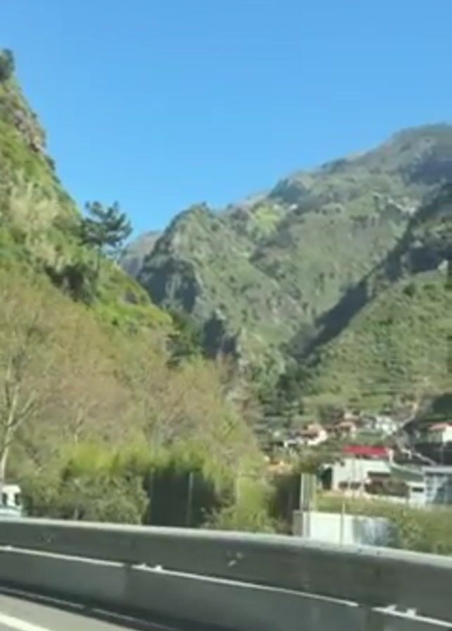 view from inside a moving vehicle, likely a car. The camera is pointed toward a mountainous landscape with green, vegetated slopes and a bright blue sky. A highway with a guardrail is visible in the foreground. A road sign reading "VE4" is briefly visible. A small settlement with buildings is nestled within the valley between the mountains. The car seems to be driving alongside the mountains on a clear day. Music plays throughout the video.