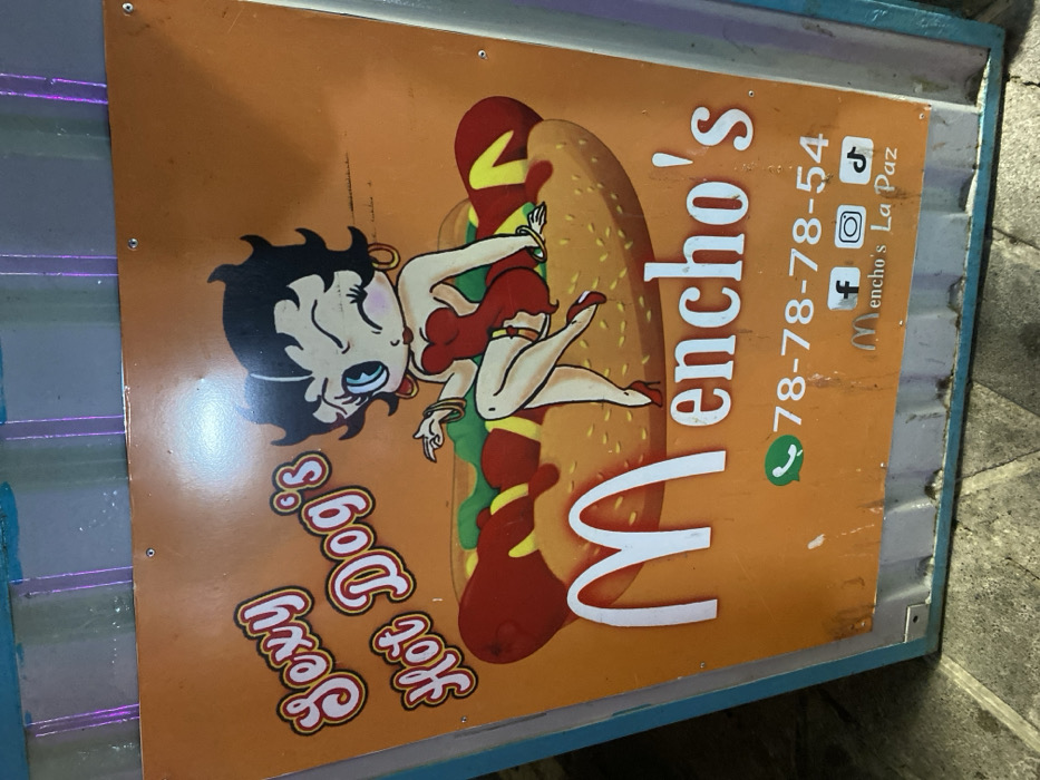 An orange sign for "Mencho's Sexy Hot Dog's" features a cartoon image of Betty Boop sitting on a hot dog. The sign also lists a phone number, 78-78-78-54, and social media icons for Whatsapp, Facebook, Instagram, and TikTok. The location is identified as La Paz. The sign is attached to a blue metal frame.