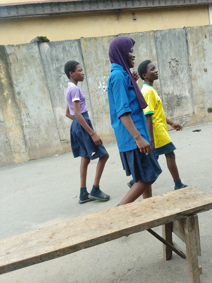 - "The image depicts an outdoor scene in Agani, Nigeria, featuring three young individuals walking from left to right on a light gray paved surface" by FM-vZmf83, licensed under CC BY 4.0