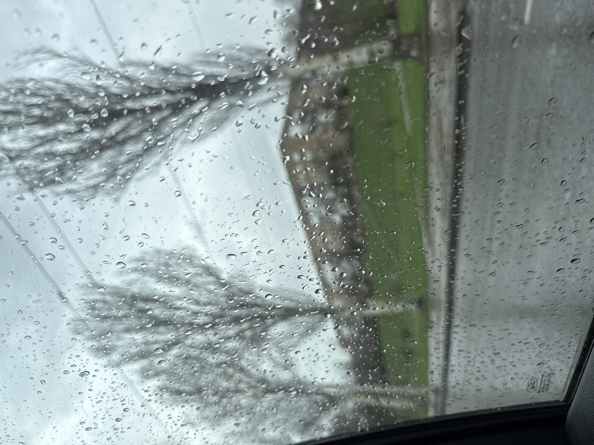 view through a rain-covered window. Outside the window, there are trees being blown by the wind, along with a green object that may be the side of a building. The location cannot be confirmed as Donetsk, Ukraine based on the visual information.