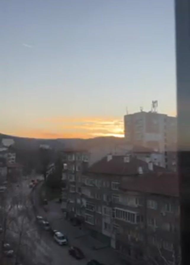 cityscape at sunset. The sky is a mix of light blue, orange, and yellow hues, with clouds tinted by the setting sun. A jet contrail is visible across the upper sky. Below, there are several multi-story buildings with red tile roofs. A tall, modern apartment building stands on the right. A street with parked cars runs through the city. Beyond the buildings, a tree-covered hill silhouette dominates the horizon. The view is from an elevated position, possibly an apartment window.