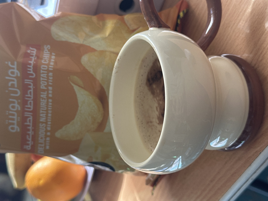 The image displays a light-colored ceramic mug with a dark brown handle and base, centrally positioned on a light brown wooden surface. The mug contains a dark brown liquid topped with foam and visible particulate matter, consistent with a hot beverage like coffee or hot chocolate. Behind the mug, an orange-colored bag of "GOLDEN POTATO CHIPS" is partially visible. The bag displays text in both Arabic ("غولدن بوتيتو" and "شيبس البطاطا الطبيعية") and English ("DELICIOUS NATUREAL POTATO CHIPS") along with illustrations of potato chips. To the left of the chip bag, a whole orange fruit is partially visible. The background is out of focus, suggesting an indoor setting. The scene appears to be a casual snack or refreshment arrangement on a table or tray in a domestic or office environment within the city of Unknown, Unknown.