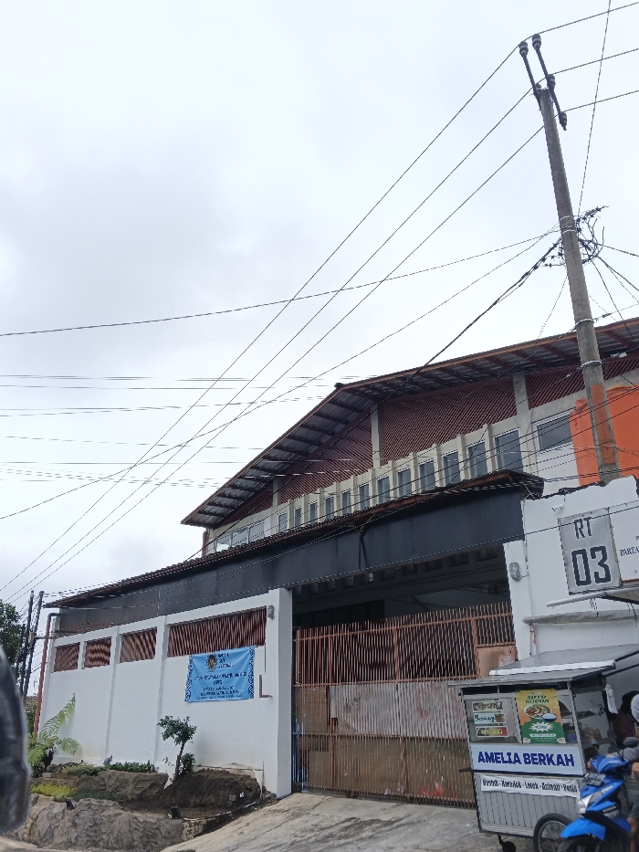 The image displays an upward-angled street-level view of a multi-story building under an overcast, light grey sky. The stated location is the city of Шчыткавіцкі сельскі Савет, Belarus, although textual elements visible in the scene suggest an Indonesian context. A grey utility pole with multiple insulators and a dense cluster of black electrical wires is positioned on the right, extending upwards from the building's roofline. Numerous power lines crisscross the upper portion of the frame. The central building features an angled roof constructed from red-brown corrugated metal sheeting over a darker substructure. Below the roof, an upper section of the facade presents a series of uniform, narrow, rectangular windows or vents against a textured red-brown wall. A dark, horizontal structural beam runs across the building below this section. The ground floor is enclosed by a white perimeter wall incorporating horizontal slatted panels of a light brown or orange color. A large, closed, multi-panel metal gate, matching the light brown/orange hue of the wall panels, provides access in the center of the wall. To the left of this gate, a blue rectangular banner with white, unreadable text, possibly in an Indonesian language, is affixed to the white wall. Adjacent to the banner, a small landscaped area with rocks and sparse vegetation, including a small tree sapling, is present. On the right side of the building, an attached white wall section displays a grey sign with "RT 03" in black text, followed by partially obscured vertical text, identifying a neighborhood unit. At street level in the lower right, a white vendor cart with a blue base is parked. The cart is labeled "AMELIA BERKAH" in blue text and features several laminated signs advertising food items like "SIOMAY" and "MIE AYAM". A blue scooter or motorcycle is parked adjacent to the vendor cart, with its front wheel partially visible. A human leg is partially visible behind the vendor cart, indicating the presence of at least one individual. The foreground ground surface is paved, appearing to be asphalt or concrete.