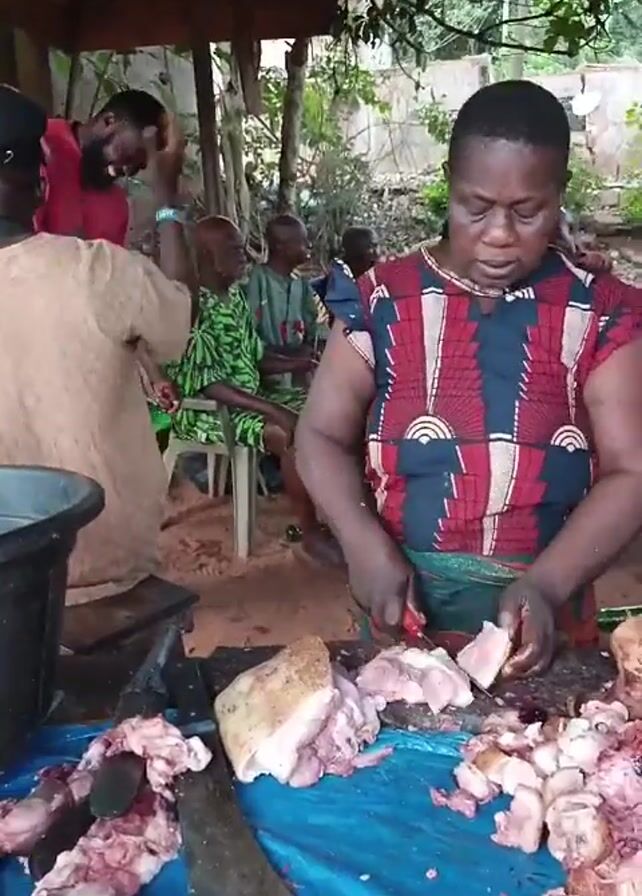 Under a covered, open-air structure, a woman wearing a colorful patterned top cuts pork on a blue tarp-covered table with a large cleaver. To her left, another person is working and putting something into a black bucket. Behind them, three men are seated, one in a green patterned shirt. The table is piled high with raw pork cuts. The area around the structure is green with trees and foliage. The woman appears focused on cutting the meat.