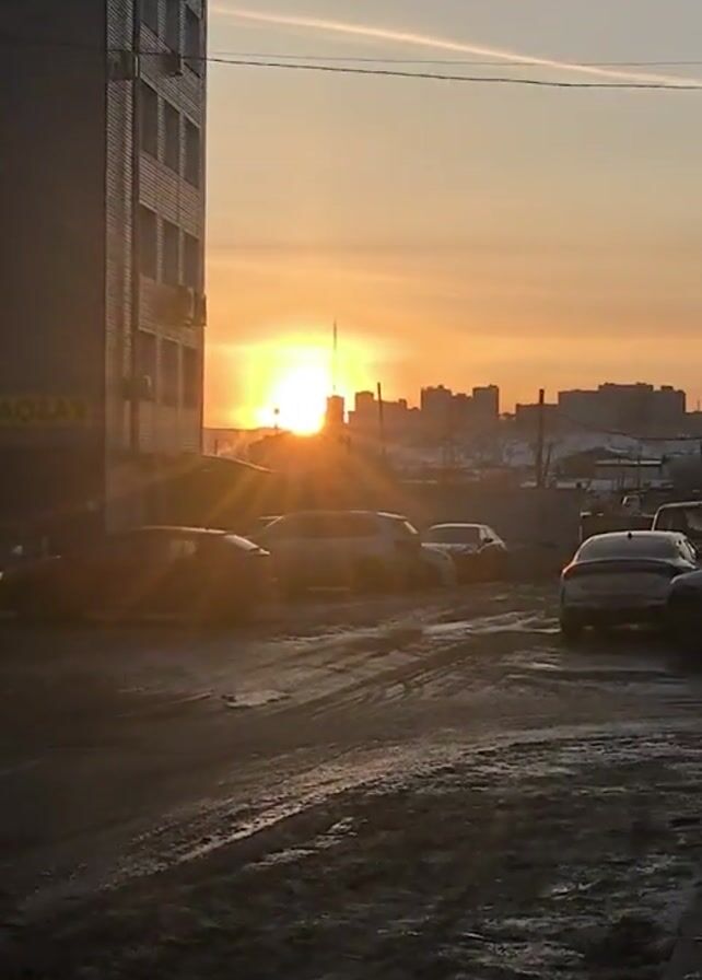 cityscape at sunset. The sun is setting behind the city skyline, casting a warm orange glow. In the foreground, there is a parking lot with several cars parked. The ground is muddy and dirty. There is a tall brick building on the left side of the frame. The sky is clear with a single contrail.