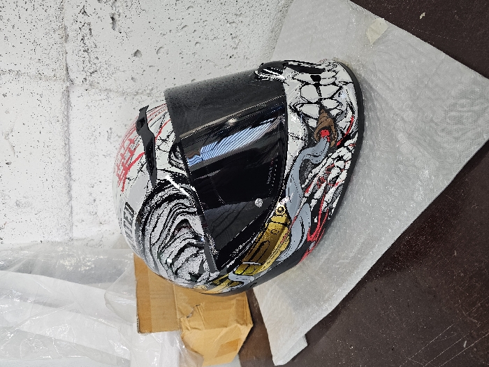 - "A full-face motorcycle helmet, predominantly white with black, gold, red, and grey graphic patterns including abstract swirls, "WANTED" text, and a stylized creature or skull motif on the lower front, is positioned on a sheet of white bubble wrap" by FM-XzcAn2, licensed under CC BY 4.0