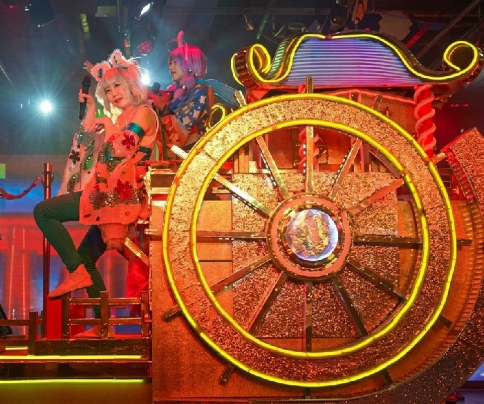 The scene depicts two female performers on an elaborate, multi-tiered stage prop within a performance venue in Shinjuku, Japan. The lighting is theatrical and colorful, predominantly red, blue, and yellow, with a bright white spotlight visible on the far left. The primary performer, positioned centrally on the left, is a female with light-colored hair styled with white, fur-like animal ears. She wears a sequined, peach-colored tunic with green and red floral patterns, green leggings, and light-colored shoes. A white garment with dark floral motifs drapes over her left shoulder, and a turquoise band encircles her right bicep. She holds a black microphone in her left hand, raises her right hand, and directs a smiling gaze towards the viewer. Her posture suggests a dynamic movement, with one leg bent as if stepping onto a higher platform. Behind and slightly to the right of the primary performer, a second female performer is partially visible. She has pink-purple hair styled with small accessories and wears a blue and gold patterned costume. She also holds a microphone. The right side of the image is dominated by a large, ornate golden wheel, approximately one-quarter of its diameter visible. The wheel is textured with glitter-like material, and its outer rim and an inner circular spoke are outlined with bright yellow neon lighting. Its central hub features a circular display or orb containing a miniature landscape scene. This wheel is integrated into a larger, gold-colored stage structure, which extends upwards to include a curved, blue-ridged section outlined in yellow neon, resembling a stylized mustache, and red spiral columns. A red velvet-roped barrier is visible on the far left, completing the theatrical setting.
