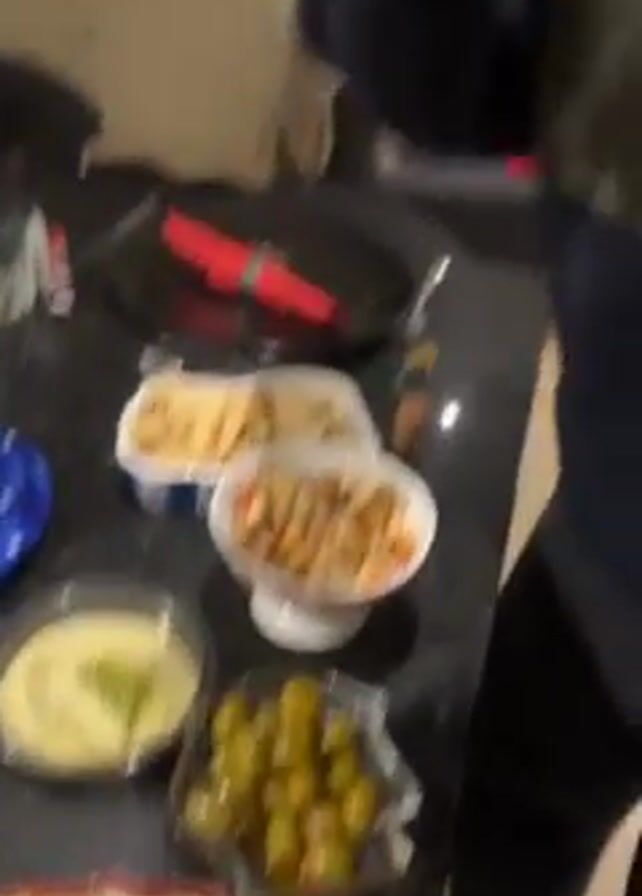 Here is a detailed description of the video. The video shows a person in a kitchen setting surrounded by several food items. The person is wearing a green and grey sweater and briefly appears to be wearing a Santa hat. They have a mustache. On the countertop, there's a plate of chips, a bowl of chickpeas, a bowl of olives, a container with dip, and other small dishes. The person picks up a piece of food, possibly a chip with a dip, and eats it. The countertop is a dark color. There is also a bottle of salt, a glass, silverware, and napkins on the counter. A red napkin is folded beneath silverware and sits on a black plate. The kitchen has cabinets in the background and appears to be inside a home.