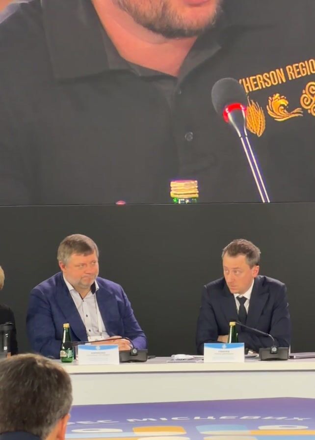 man speaking at a conference, broadcasted on a large screen behind a table where two men are seated. The speaker is wearing a black shirt with a gold emblem on the chest. The man on the left wears a blue blazer, while the man on the right is in a dark suit. Both men have microphones in front of them and paper in front of them, presumably related to the conference. The audience is partially visible in the foreground. The speaker on screen seems to be emphasizing a point, while the seated men listen.