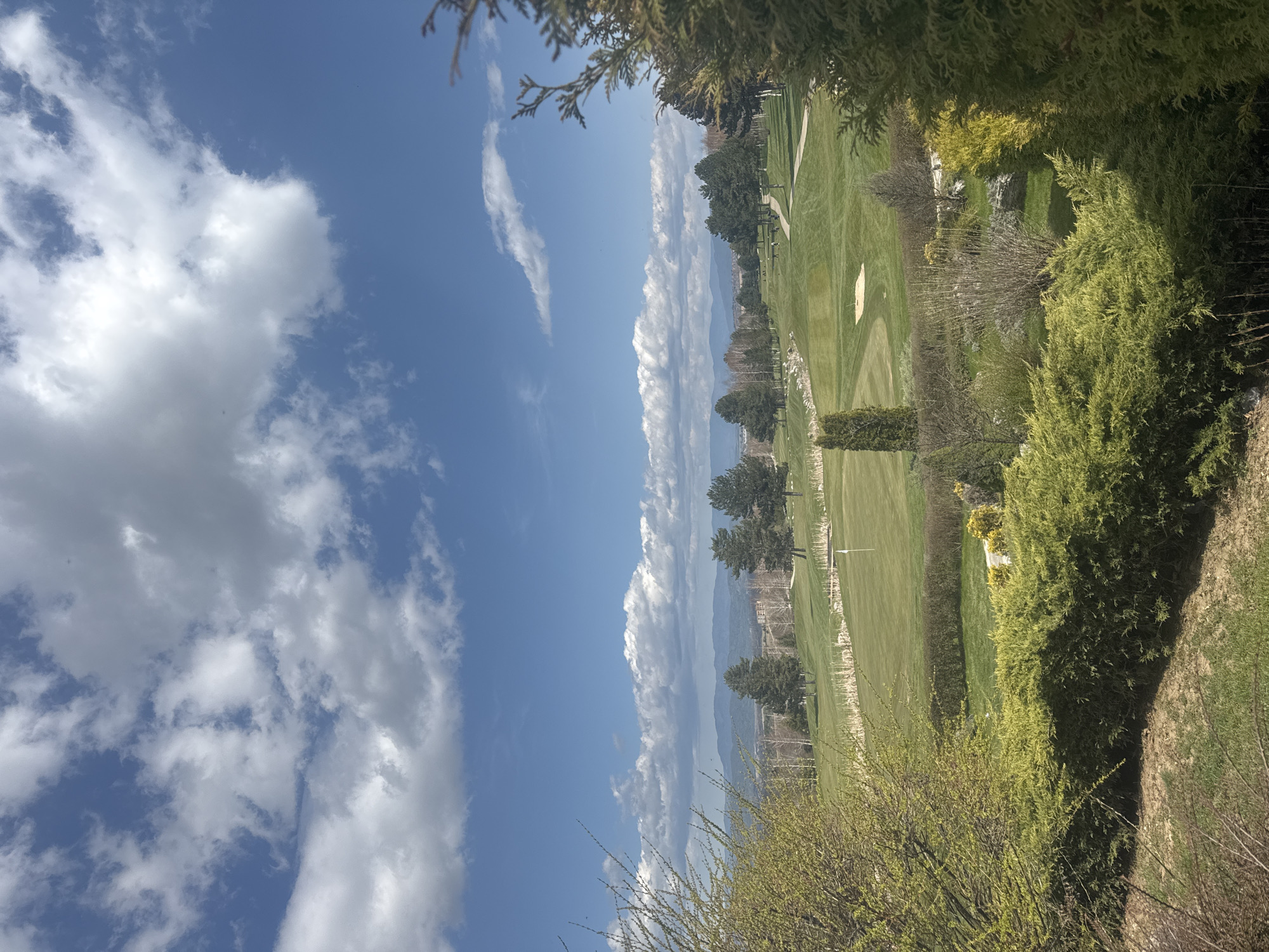golf course landscape in Razlog, Bulgaria, under a bright blue sky with scattered white clouds