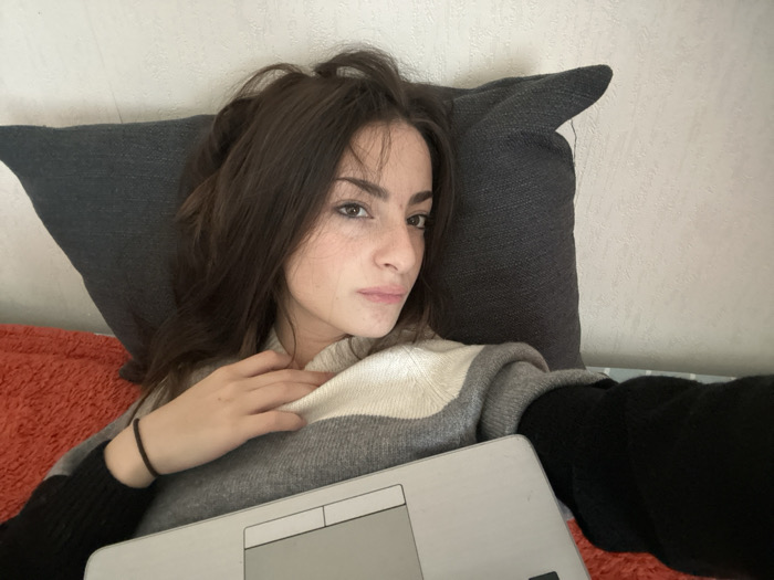 - "The scene depicts a young adult female, estimated to be in her early twenties, reclined against a dark grey pillow in an indoor domestic environment located in Strasbourg, France" by FM-vVQbp1, licensed under CC BY 4.0