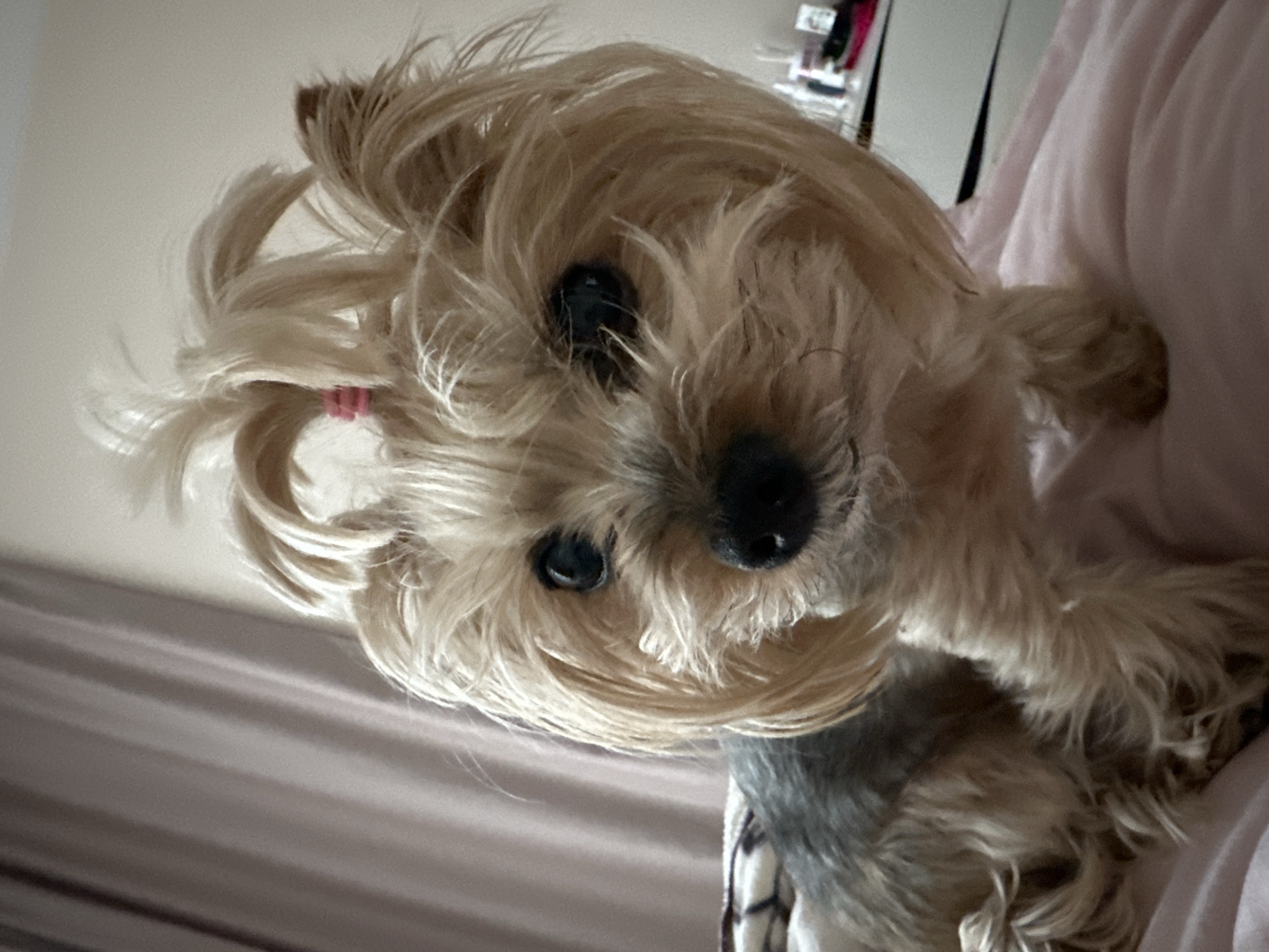 - "A close-up, slightly tilted, indoor photograph features a Yorkie dog with light blonde and gray-brown fur" by FM-i77MU2, licensed under CC BY 4.0