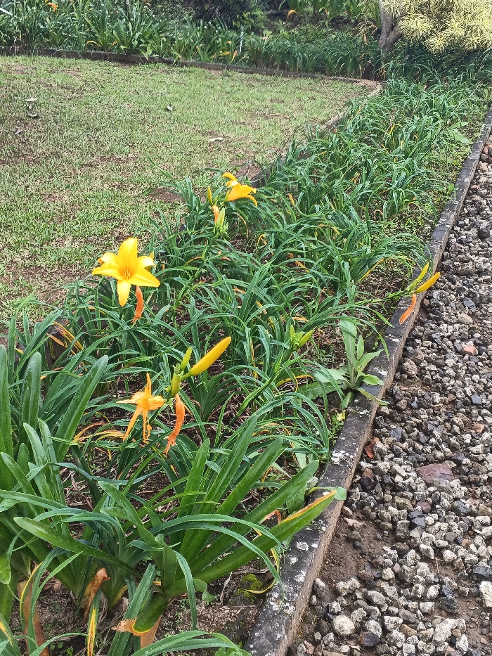The image displays a horticultural scene within the city of Akshatau, Kazakhstan. In the foreground and midground, a linear flower bed contains numerous daylily (Hemerocallis) plants. These plants exhibit long, green, strap-like leaves. Several fully bloomed yellow daylilies are visible, characterized by six petals and prominent orange central reproductive structures. Additionally, multiple elongated yellow-orange flower buds are present. Some leaves show browning tips. The flower bed is bordered on its right by a dark grey concrete curb, exhibiting minor weathering and light-colored surface deposits. Adjacent to the curb on the right, a path surface composed of irregular grey and brown gravel is present. To the left of the flower bed, a manicured lawn with short green grass extends towards the background. Distant background elements include blurred green foliage and trees. No individuals, animals, or explicit actions are depicted.
