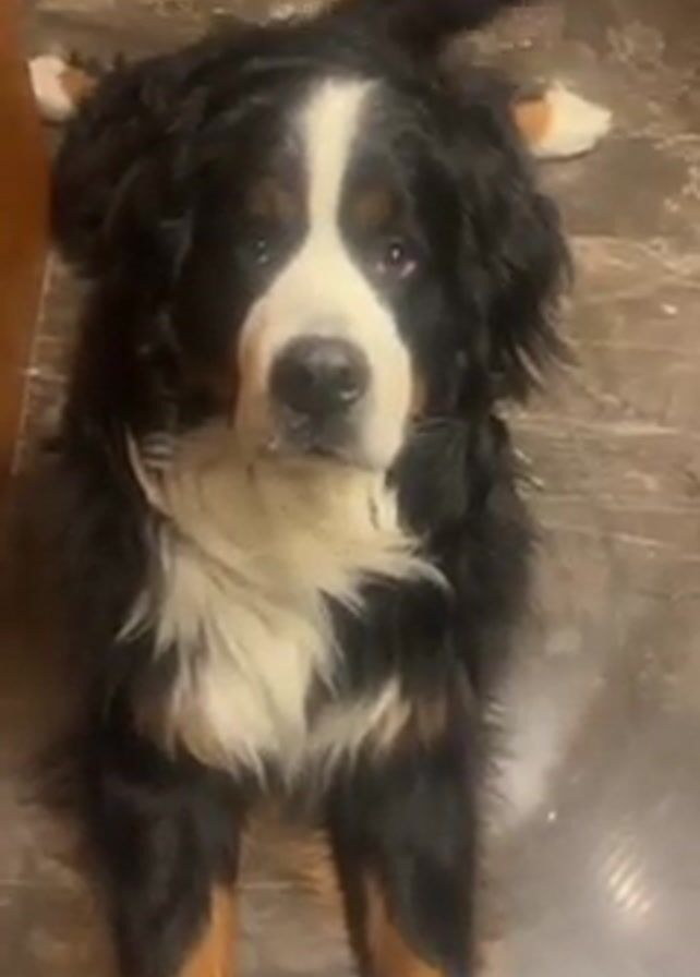Bernese Mountain Dog named Teodoro lying on a marble-patterned floor. A person says “Saluda, Teo,” and then says “Teodoro.” The dog is facing the camera. A wooden door or cabinet is visible at the left edge of the frame.