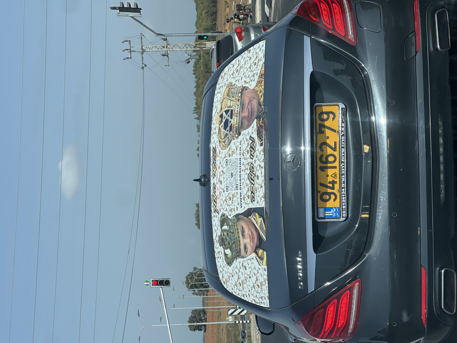 The image displays the rear of a dark grey Mercedes-Benz S 500e sedan, stationary at a traffic light in Kfar Yona, Israel. The vehicle features an Israeli license plate, number 94-162-79, with "ת.א.מ. מרכז שירות לרכב בע"מ 03-6134134" (T.A.M. Car Service Center Ltd.) printed below the numbers. The entire rear window is covered by a patterned decal depicting two stylized portraits: a woman wearing a multi-jeweled crown, identified as "QUEEN TAMAR," on the left, and a man wearing a golden crown with a blue Star of David on the right. The decal includes the English text "THE ONE," the website "www.SHARSHAR.CO.IL," a QR code, and the Hebrew phrase "אין כמו בבית" (There's no place like home). In the background, a traffic light on the left is illuminated red, while another further to the right appears green. Streetlights, utility poles with power lines, and distant vegetation are visible. The sky is clear blue with one small white cloud. A light-colored SUV is partially visible behind and to the right of the Mercedes, with an individual on a small motorized scooter or bicycle in the immediate vicinity. The perspective is from a vehicle directly behind the Mercedes-Benz.