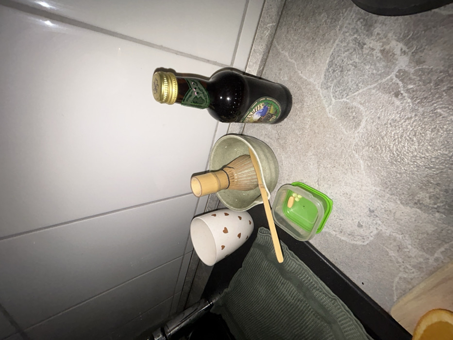 The scene depicts a countertop arrangement in an indoor setting, likely a kitchen, located in Hagen, Germany. The countertop surface is grey with a mottled or textured pattern, backed by a white tiled wall with visible grout lines. From left to right: On the far left, a portion of a chrome-finished faucet is visible. Adjacent to it, on a dark, flat surface, a dark green, ribbed textile item, possibly a towel, is neatly folded. Partially visible in the bottom-left corner is a slice of an orange resting on a light-colored wooden cutting board. Centrally positioned on the countertop is a white ceramic mug adorned with multiple small, reddish-brown heart patterns. To its right, a greenish-grey ceramic bowl contains a light brown bamboo matcha whisk and a light brown bamboo matcha scoop. In front of this bowl, slightly to the left, rests a small, rectangular, clear plastic container with a bright green lid. Inside this container, approximately four pills, yellow and white in color, are visible. To the right of the bowl, a dark brown glass bottle stands upright. It features a gold-colored twist-off cap and a green label, which includes an unidentifiable graphic (appearing as a landscape) and unreadable text. The scene is illuminated by an overhead light source, casting soft shadows. No people are present, and no actions are in progress.