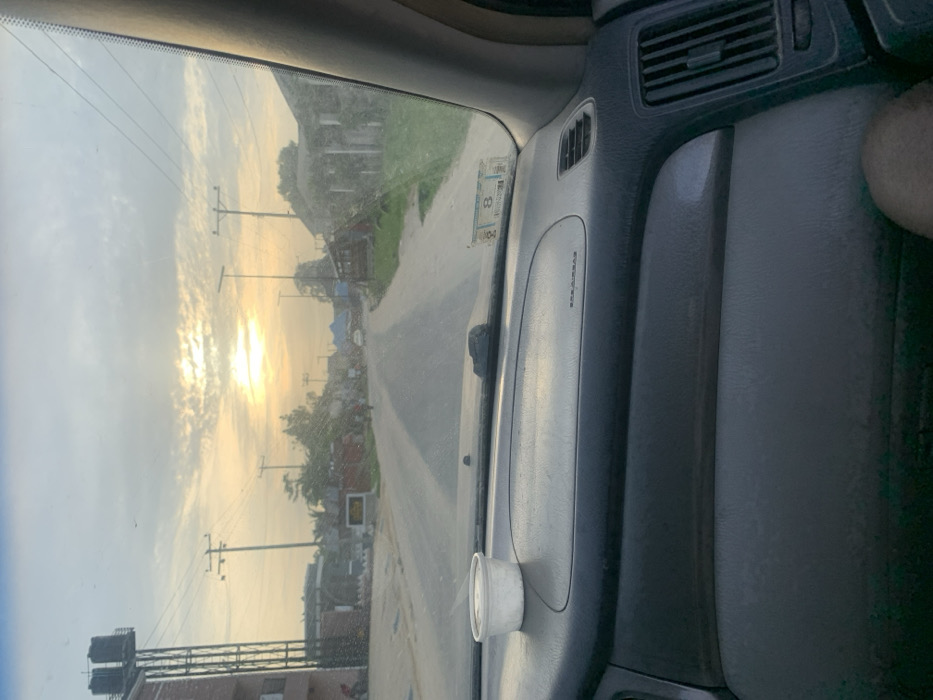 view from the driver's seat of a car driving down a street in Umuola, Nigeria. The street is paved and has a few cars parked on either side. There are trees and buildings along the street. The sky is cloudy and the sun is setting in the distance. There is a small white container on the dashboard of the car and a sticker on the windshield. The driver's leg is visible in the lower right corner of the image.
