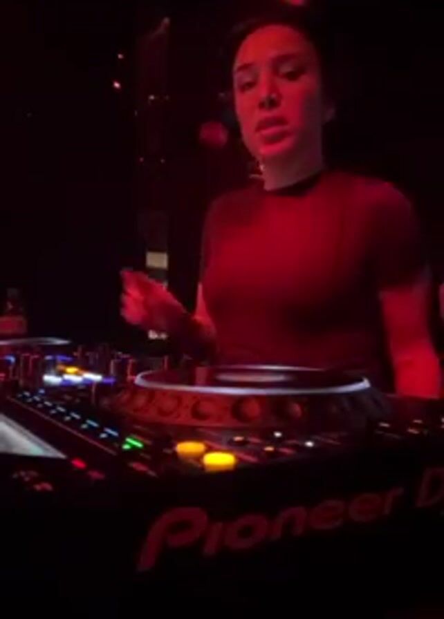 A DJ is seen performing in a dimly lit club. The DJ, a woman with short, dark hair, wears a dark red shirt and headphones. She stands behind a Pioneer DJ mixer, operating the controls with her hands while seemingly singing along to the music. Red mood lighting is prominent in the dark environment. A bottle of water sits on the table next to the mixer.