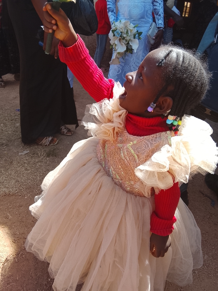 This image depicts an outdoor scene in the city of Gwafan, Nigeria. A young dark-skinned girl is prominently featured in the foreground, positioned slightly left of center. She wears a red long-sleeved top beneath a light beige or champagne-colored dress featuring a sequined bodice and multiple layers of ruffled tulle. Her hair is styled in short braids, adorned with colorful beads on the ends near her ears. Her right arm is extended upwards, with her hand grasping a green-stemmed object, possibly a small flower or a portion of a floral arrangement. Her mouth is open, and she looks directly upwards, appearing to be in motion or engaged in an interaction above her. In the mid-ground, to the left, the lower half of an adult in a black ankle-length garment and brown sandals is visible. To the right of the girl, an adult in a white, long-sleeved wedding dress holding a white and light blue floral bouquet is partially visible, indicating a wedding or celebratory event. Another figure wearing a red top is visible further in the background. The ground is composed of dry, reddish-brown earth/dirt, consistent with an outdoor environment under daylight conditions.