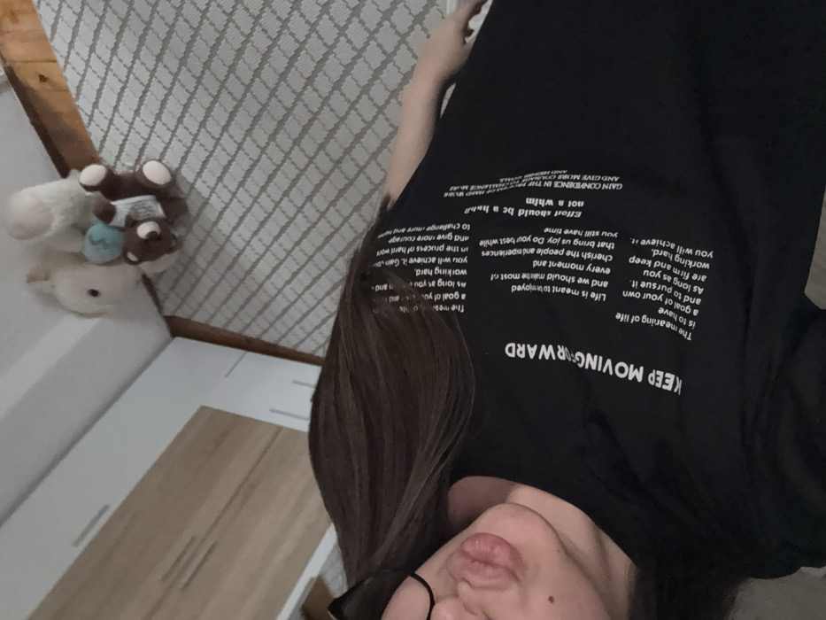 An indoor, diagonally oriented photograph displays a partial view of an individual and elements of a room. The subject, a person with long dark hair and eyeglasses, is positioned on the left, with their face angled to the right. Their lips are pursed, and the tongue is slightly extended. They are wearing a black short-sleeved t-shirt with white text. Prominently visible text includes "KEEP MOVING FORWARD," followed by smaller text blocks containing phrases such as "The meaning of life is to have a goal of your own..." and "Effort should be a habit not a whim." In the upper right background, two stuffed animals are situated on a light grey patterned rug or carpet. One animal is white and indistinctly shaped, possibly a rabbit or squirrel. Adjacent to it is a brown stuffed bear holding a small, light blue spherical object. A light-colored wooden wardrobe or cabinet with horizontal handles is partially visible on the left side of the background. The scene is located in Razlog, Bulgaria.