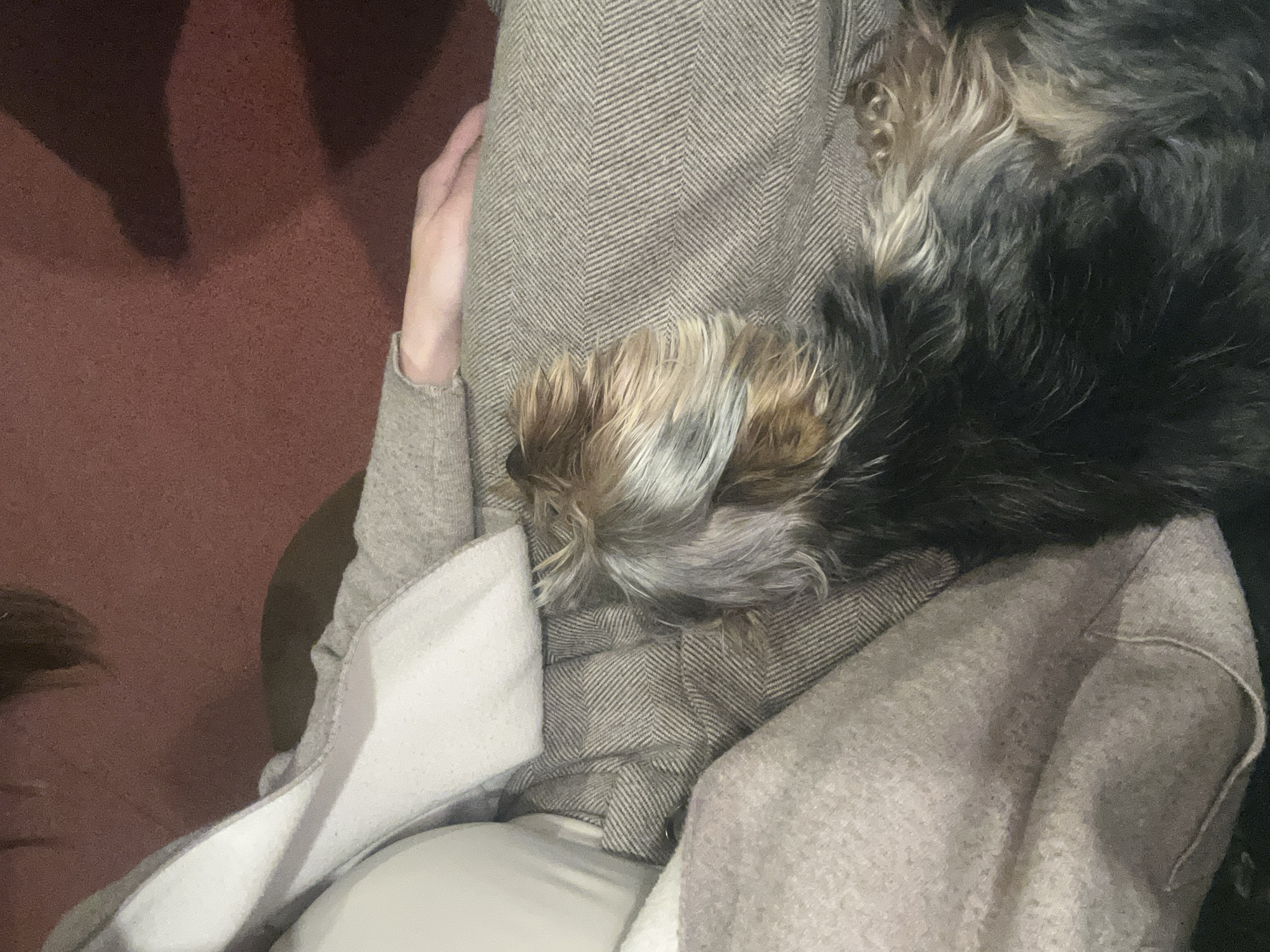 A dog rests on a person's lap. The person is wearing a beige-toned, herringbone-patterned coat with a white lining visible at the edge, and a beige sweater underneath. The dog has brown, grey, and black fur. The background appears to be a simple, dark room with a reddish-brown floor. There is no information in the image to place this scene in Varna, Bulgaria.