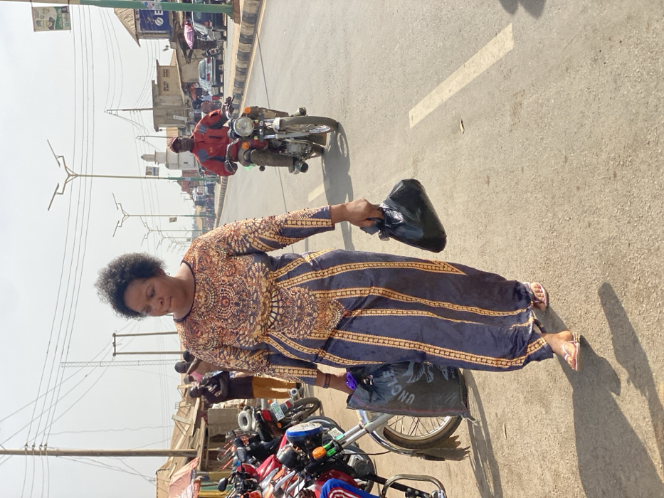 A woman stands on a sunny street, facing left. She wears a long, patterned dress with orange and dark blue hues and holds a black plastic bag. Beside her are parked motorcycles, and behind her is a street scene with a man on a motorbike and other vehicles. Utility poles line the road in the background.