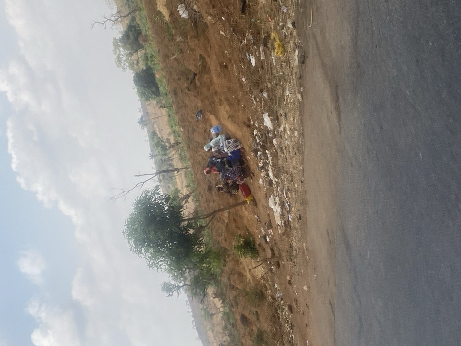 The image depicts an outdoor scene in Nandu, Nigeria, featuring approximately seven individuals, primarily women, seated on a reddish-brown dirt embankment adjacent to a paved road