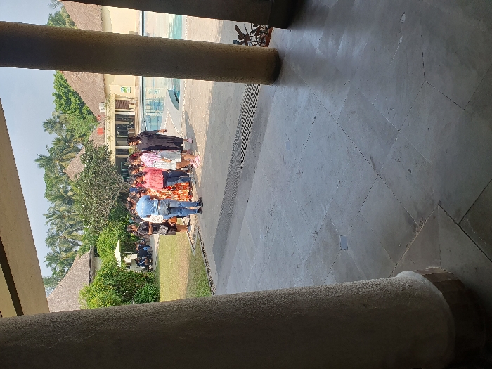 A group of people stands in front of a building with a thatched roof. A pool is visible in the background. The scene is viewed through a partially obstructed foreground, likely from a covered walkway or patio, defined by two prominent columns or posts. The ground is tiled with light gray stones, and the overall light suggests a bright, sunny day.