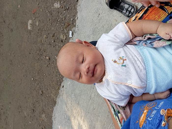 A bald baby, dressed in a white shirt and light blue pants, lies in someone's lap. The baby's eyes are closed, and the person holding the child wears colorful patterned pants. Part of a black shoe is visible in the upper portion of the image. The background is comprised of concrete and what appears to be dirt or soil. The photo's composition is slightly angled.