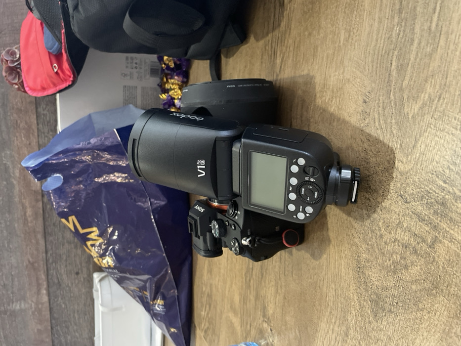 The image displays photography equipment arranged on a light brown, wood-grain surface in an indoor setting within the city of Svilengrad, Bulgaria. In the foreground, a black Sony mirrorless camera, featuring a red circular detail on its left side, is equipped with a dark-colored lens (bearing "SIGMA" text) and a black Godox V1S round-head flash unit mounted on its hot shoe. The flash unit displays an unilluminated LCD screen and multiple control buttons. To the immediate left of the camera setup, a transparent plastic bottle is partially visible. In the background, behind the camera and to the left, lies a crumpled blue plastic bag with yellow lettering. A white rectangular object is partially visible behind the blue bag. To the right of the camera, a black photography bag or backpack is present, partially open to reveal a red fabric item. Several individually wrapped candies or chocolates, predominantly in purple and gold wrappers, are scattered on the surface between the camera and the black bag. A white cardboard box is partially visible behind the black bag. No people are depicted.