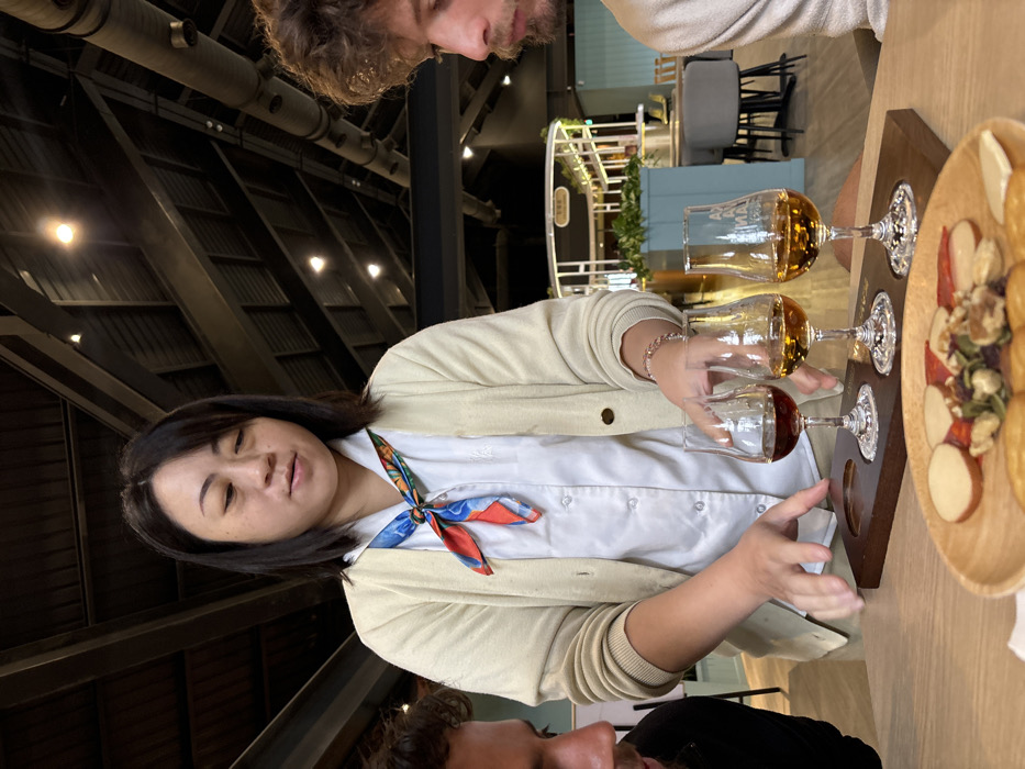 The scene depicts an indoor tasting area within a facility in Yuanshan, Taiwan. A female individual, identified as East Asian, stands centrally, clad in a light beige cardigan over a white button-down shirt with a multi-colored scarf. She has dark, chin-length hair and is focused on a dark wooden tasting flight tray before her. The tray holds three stemmed glasses, each containing an amber-colored liquid; the leftmost liquid is a darker reddish-brown, while the other two are golden amber. One glass is branded "KAVALAN". Her hands are positioned near the glasses, suggesting presentation or interaction with the flight. To her left and right, partial profiles of two Caucasian males with curly, light brown hair and beards are visible, observing the tasting setup. In the foreground, a round wooden plate contains various food items, including sliced apples, red fruit or cured meat, nuts, seeds, and crackers. The background reveals a modern interior with high, dark, exposed ceilings featuring structural beams and recessed lighting. A bar or service area with light blue and grey accents, and a circular white display unit with greenery, is visible in the distance.