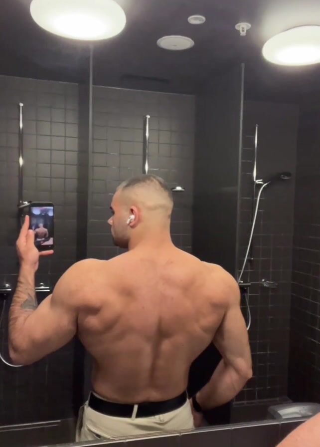 A shirtless man with a muscular back poses in front of a bathroom mirror and takes a selfie. He has short hair and is wearing white pants and a black belt. He wears an earpiece in his left ear and a watch on his left wrist. The bathroom has black tiled walls and two overhead lights. The man flexes his biceps for the photo. He holds his phone in his left hand. The reflection in the mirror shows two shower heads. The bottom right corner of the frame has a blurry portion of a person's arm.
