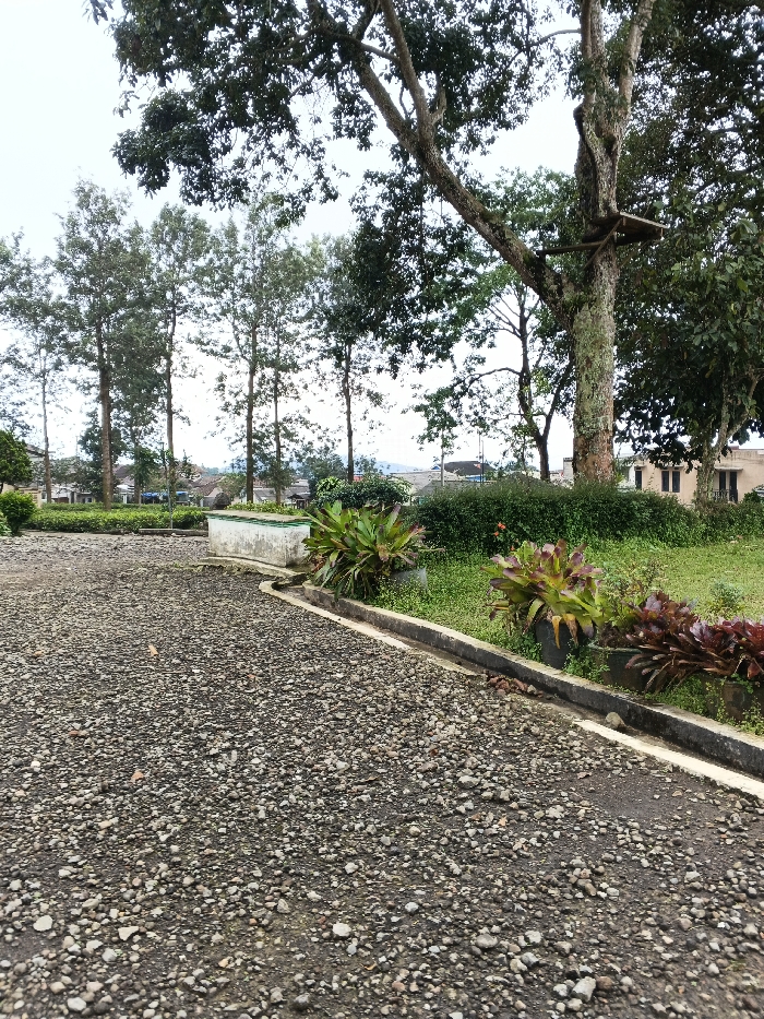 The image presents an outdoor scene located in Bien Hoa, Vietnam, characterized by a mix of natural elements and man-made landscaping. The foreground features a dark gray, irregularly textured surface composed of small gravel or crushed stone. This surface is bordered on the right by a concrete curb and an integrated narrow drainage channel. Immediately adjacent to the curb lies a strip of green grass, followed by several dark-colored planters containing large, robust Bromeliad plants displaying green and reddish-brown foliage. Further back, a rectangular, light-colored concrete trough or planter is situated among green foliage. The midground and background are densely vegetated. On the right, a large, mature tree with a thick, textured trunk, partially covered in moss or lichen, rises prominently. A small, flat wooden platform or perch is affixed to one of its substantial branches. To the left of this tree, a row of five tall, slender trees with relatively sparse green foliage extends across the frame. Beyond the vegetation, several low-rise buildings with light-colored walls and dark roofs are visible. The distant horizon reveals faint outlines of hills or mountains under a light, overcast sky. No individuals are present, and no specific actions are occurring within the frame.