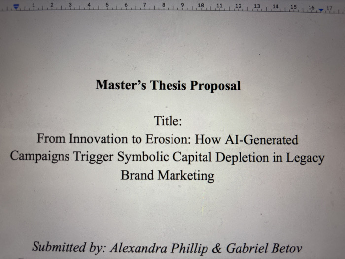 This image displays a close-up, slightly off-angle photograph of a digital document or printed page, specifically a "Master's Thesis Proposal." The document is centrally titled "Master's Thesis Proposal" in bold. Below this, it lists "Title:" followed by the thesis title: "From Innovation to Erosion: How AI-Generated Campaigns Trigger Symbolic Capital Depletion in Legacy Brand Marketing." At the bottom, partially visible, are the names of the submitters: "Submitted by: Alexandra Phillip & Gabriel Betov." A ruler from a word processing application, showing numerical increments from 1 to 17, is visible across the top of the frame. The background is a light gray with subtle textural variation, consistent with a screen display or textured paper. No individuals or actions are depicted. The scene is presented as occurring in the city of Stockholm, Sweden.