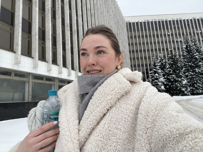 A young adult female is depicted in a close-up, outdoor shot against a snowy backdrop, identified as the area surrounding the House of the Government of the Russian Federation (White House of Russia) at Krasnopresnenskaya Embankment 2, Moscow. She has light brown hair pulled back, blue eyes, and a slight smile, gazing towards her right (viewer's left). She wears a cream-colored, textured coat and a grey scarf around her neck. A small gold-colored hoop earring is visible on her left ear, and a multi-banded ring is on her left ring finger. In her left hand, she holds a clear plastic bottle with a blue cap, featuring a partially visible label for "Черноголовка" (Chernogolovka) brand water. The background features a large, multi-story, light-colored building with a facade characterized by prominent vertical architectural elements separating large window sections. To the right, several snow-covered evergreen trees are visible. The ground is covered in a layer of snow, indicating a winter environment. The lighting is diffuse, consistent with an overcast sky.