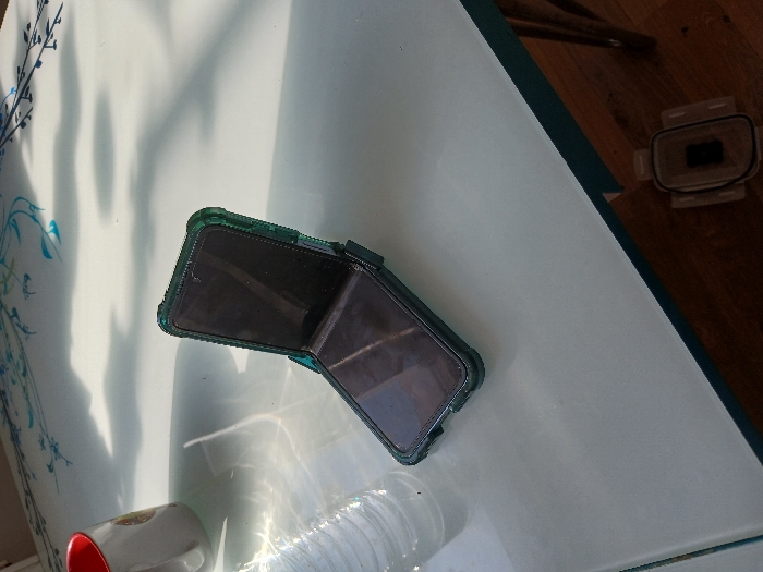 On a white table, a green phone case is slightly ajar