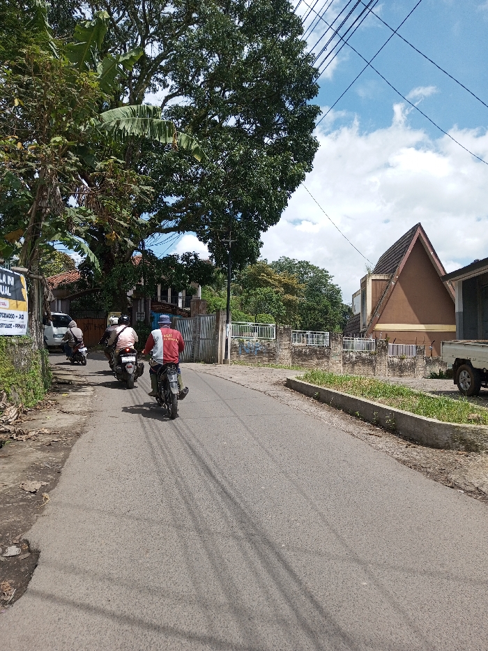 The scene depicts a paved street in Ariyalai, Sri Lanka, under a bright sky with scattered white clouds. Three individuals on motorcycles are traveling away from the camera down the center of the road. The lead rider wears a red and white long-sleeved shirt and a light-colored cap. The asphalt road surface shows minor wear. Overhead utility lines cast long, distinct linear shadows across the roadway. On the left side, dense green foliage, including large trees and banana plants, borders the street. A white van is partially visible behind these trees, and a weathered sign is affixed near the foreground. On the right, a low brick wall topped with a white metal fence, displaying some graffiti, runs alongside the road. Behind this wall, a building with a distinctive brown-tiled, steeply pitched roof and brown walls is prominent. A light-colored pickup truck with an open bed is parked adjacent to this building. Additional residential structures and abundant greenery are visible in the background.