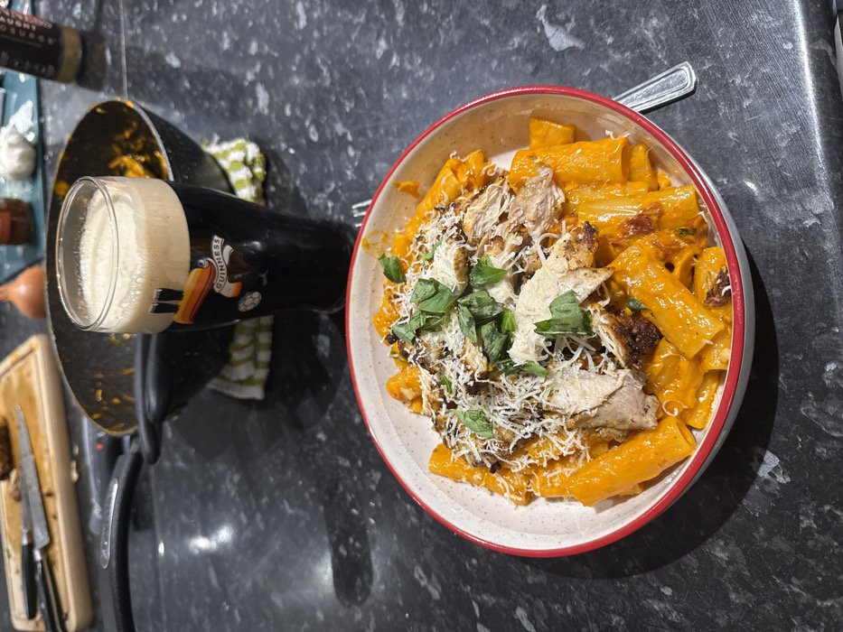 The image displays a domestic kitchen countertop, predominantly dark grey with white speckles. In the foreground, a white ceramic bowl with a red rim contains rigatoni pasta coated in an orange-red sauce. The pasta is topped with shredded grilled chicken pieces, finely grated white cheese, and fresh green basil leaves. A silver fork handle is partially visible on the right side of the bowl. In the midground, a clear glass pint of Guinness stout, featuring a toucan and football motif on its side, stands with a distinct creamy head. Behind the glass, a dark frying pan with a handle rests on a white and green striped kitchen towel, containing residual orange-red food matter. The background shows further kitchen elements: a wooden cutting board with two knives and food remnants (possibly cooked meat) on the far left. Towards the center-right background, an orange onion, a white garlic bulb, and a partially obscured bottle of sauce are visible on the countertop. No individuals are present. The precise location within Newcastle upon Tyne, United Kingdom, is not discernible from the visual evidence provided; the scene depicts a generic private kitchen setting.