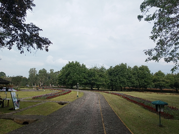 A park scene under a cloudy sky, showcasing a cobblestone path winding between green lawns. Rows of red flowers border the path. Tall, leafy trees line the background and frame the top corners of the image. A small structure with a booth sits on the left, while a decorative lamp post stands on the right, adding visual interest to the landscape.