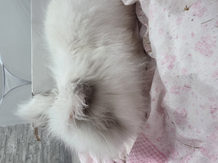 - "A white, long-haired rabbit, consistent with an Angora breed, is resting on a pink and white patterned textile surface" by FM-SXaEj1, licensed under CC BY 4.0