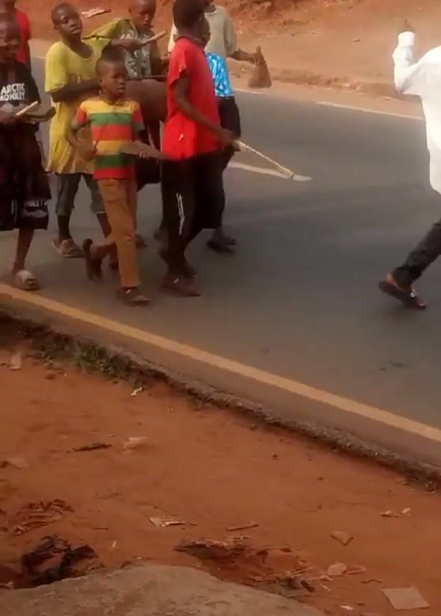 group of children walking on the side of a road. One of them is holding a drum and others are carrying sticks. They are marching along the road, seemingly parading. The environment appears to be a rural area, with red dirt and vegetation visible on the side of the road. The children's clothing varies, and some are wearing sandals or flip-flops. The video has a slightly shaky quality.
