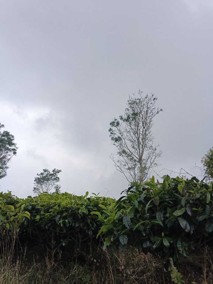 The image displays an outdoor natural landscape in an unknown city in Vietnam under an overcast sky. The upper two-thirds of the frame consist of a pale grey, heavily clouded sky, indicating diffuse light. In the foreground, a dense, cultivated row of dark green leafy bushes, likely tea plants, extends horizontally across the lower third of the image, showing patches of lighter green new growth. Below these bushes, a narrow strip of dry, light brown grass and darker soil is visible. Three trees are present in the midground and background. A prominent, tall, slender tree with light-colored bark and mostly bare branches, save for sparse green foliage at its top, stands slightly right of the frame's center. To its left, a smaller tree with a rounded, dark green canopy is visible further back. On the far left, the upper portion of a tree with dense, dark green foliage is partially visible. No people, animals, or man-made structures are depicted. The environment is agricultural or rural, characterized by vegetation.
