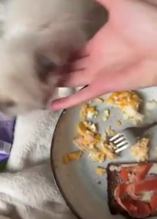 The scene is an indoor close-up shot showing a person eating breakfast in bed with their cat