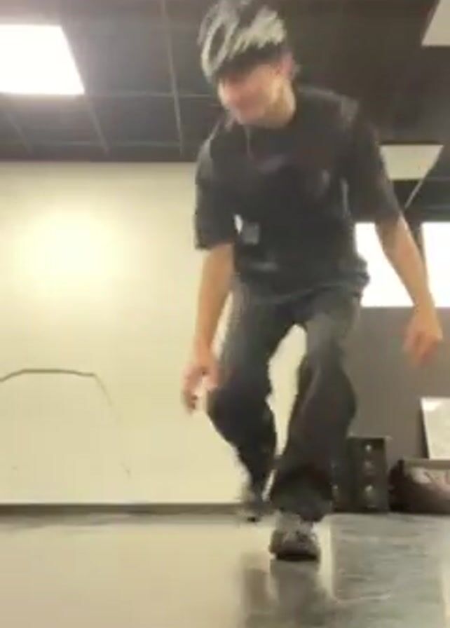 A person wearing a black beanie, black shirt, and black pants is in a room with a black ceiling and a shiny, gray floor. The walls are mostly white, and there are windows on the right side of the frame. The person starts out in a crouched position, looking at the camera and making a hand gesture with two fingers extended. They then transition into a breakdancing move, flipping onto their head and using their arms for support while swinging their legs in the air. There is a bag on the floor to the right of the person. The lighting in the room is bright from the overhead lights.