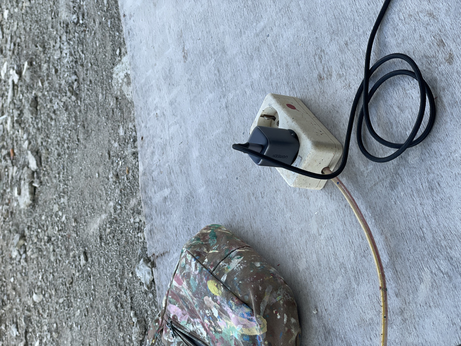 The image displays an outdoor or semi-outdoor setting on a light grey, textured surface, possibly concrete, located in Mns Asan, Indonesia. An off-white, two-socket electrical power strip is positioned in the lower-middle right. A dark grey UGREEN brand wall charger is plugged into the left socket, from which a coiled black braided cable extends toward the lower right. A separate, yellowed electrical cable, marked with faint red spots, protrudes from the right side of the power strip, extending toward the lower left. To the immediate left, a brown canvas bag is visible, heavily stained with multiple colors of paint including pink, yellow, green, blue, white, and orange, with a zipper closure visible at its top edge. The upper half of the frame reveals a rough, unpaved ground surface consisting of grey gravel, small stones, and debris. No individuals are present in the scene.