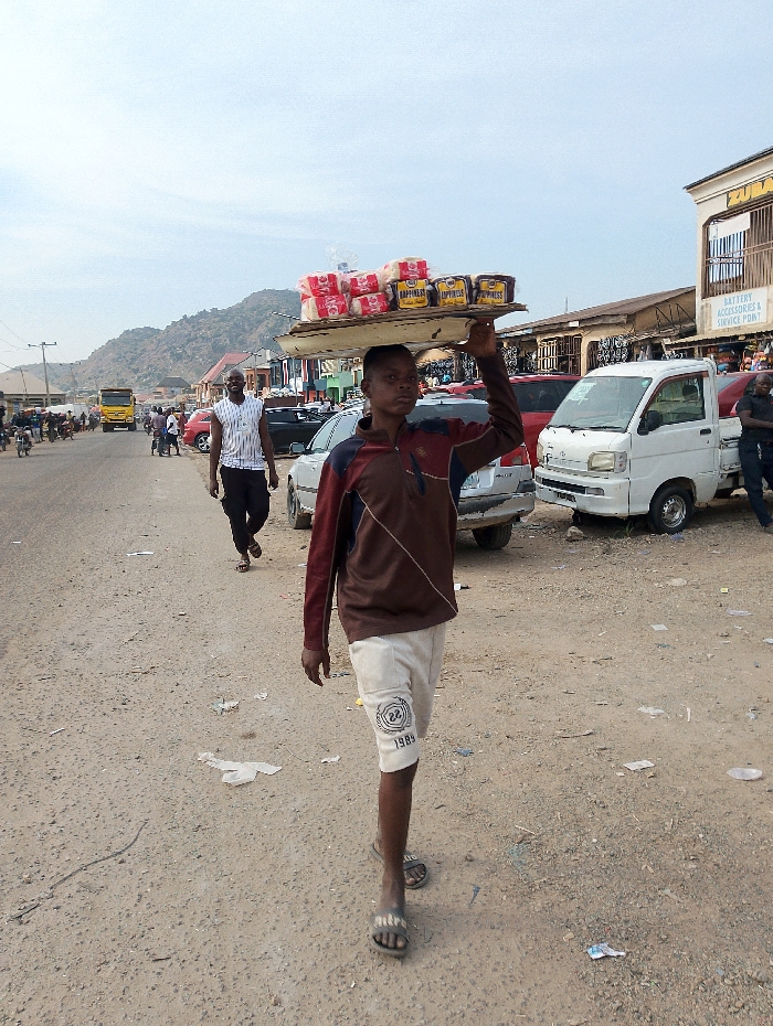 A young man walks on a dirt road, carrying a tray of bread on his head. He wears a brown and maroon shirt, white shorts, and sandals. In the background, cars and people populate a bustling street scene with buildings and parked vehicles. Mountains are visible in the distance under a cloudy sky. Litter is scattered on the ground around the man.