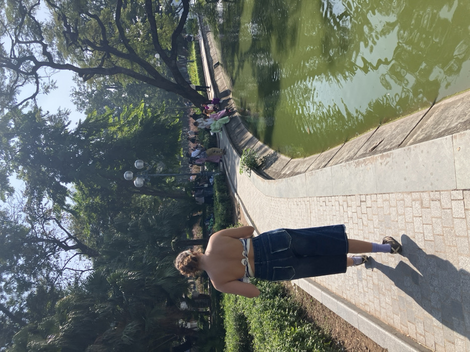 A person stands by a pond in a park. The individual is facing away from the camera, wearing a dark denim skirt, shoes and socks. The person's upper back is bare. A group of people is sitting in the shade of large trees in the background. The pond is surrounded by a concrete wall and a brick walkway. The park has lush greenery and lamp posts. The day appears sunny.