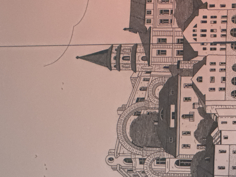 - "This is a stylized illustration depicting an urban panorama of Mahilyow, Belarus, rendered in black line art with cross-hatching for shading, overlaid with a reddish-pink hue" by FM-zJF163, licensed under CC BY 4.0