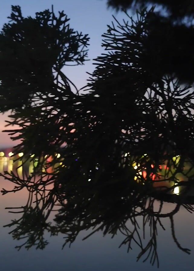 The camera focuses on a silhouette of a tree branch against the backdrop of a tranquil lake at dusk. The sky transitions from a deep blue to a soft pink, reflecting in the still water. The lights from buildings or structures across the lake create bright, elongated reflections. The scene is peaceful and serene, emphasizing the natural beauty of the water and sky juxtaposed against the man-made lights.